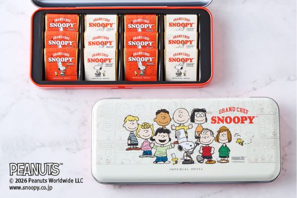 帝国ホテル 東京オリジナルの「料理長スヌーピー」をあしらった数量限定のデザイン缶に、見た目も華やかな2種類のマーブル模様チョコレートを詰め合わせた商品です。濃厚なブルーベリーの風味が楽しめる「ブルーベリーマーブル」と、甘酸っぱい苺とラズベリーを組み合わせた「苺ラズベリーマーブル」が入っています。カラフルでフルーティーな味わいは、スヌーピーファンのみならず、冬の贈り物としても喜ばれる特別なアソートです。