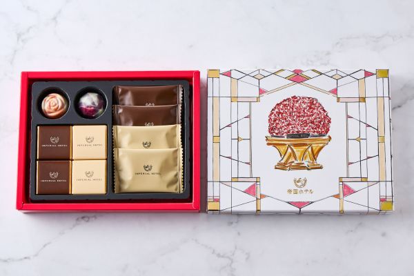 冬の帝国ホテル 東京のメインロビーを彩る赤いバラの装花は、訪れる人々を温かく迎える象徴的な存在です。その装花のイラストをあしらった紙製パッケージに、6種類のチョコレートを詰め合わせました。
