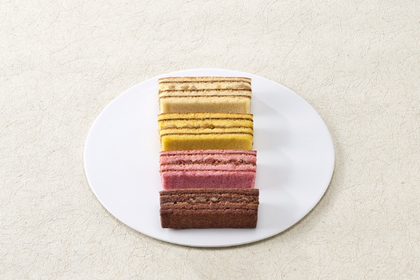 帝国ホテルで長年愛されているバウムクーヘンを、彩り鮮やかなスティック状に仕立てました。バウムクーヘンは、その断面が樹木の年輪に見えることから、古くより長寿や繁栄を願う縁起物として親しまれてきました。商品の持つ本来の意味を大切にしながら、より「手軽」に、そして味も見た目にも「楽しさ」「華やかさ」を感じていただけるように、厚めにふんわりと焼き上げた生地に、4種類のフレーバーに合わせたナッツやドライフルーツを挟みました。生クリームとラム酒が香る王道の「プレーン&マカダミアナッツ」、甘酸っぱい味わいの「ストロベリー&クランベリー」、レモンリキュールを加えた「レモン&アーモンド」、しっとりとしたチョコレート生地の「チョコレート&オレンジ」の4つの味わいをお楽しみいただけます。午後のティータイムに彩りを添え、大切な方への感謝を伝える贈りものとしても最適です。
