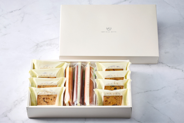 しっとりとした食感が特徴のスティック型ケーキと、スライスしたフルーツケーキ・ペカンナッツケーキの詰合せです。素材の風味を生かしたスティックケーキは、プレーン・チョコレート・メープルの3種類。フルーツケーキはレーズンやチェリー、オレンジを洋酒にじっくりと漬け込んで焼き上げ、ペカンナッツケーキは、香ばしいペカンナッツにオレンジの爽やかさを添えました。手土産や、ビジネスシーン、さらにはご家族の集まるお祝いの場など、幅広いシーンにおすすめできる商品です。帝国ホテルの包装紙と、バラをデザインした包装紙(掛け紙)のラッピングをしてお届けいたします。
