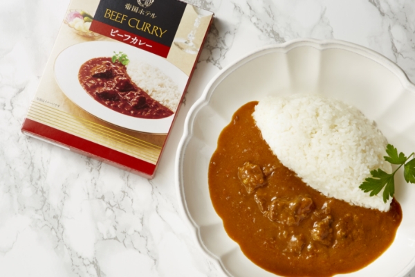 みじん切りの香味野菜を丹念に炒めて甘みを出し、トマトやチキンブイヨンと共にじっくりと煮込んだ帝国ホテル伝統のカレーです。あえて裏ごしをせず野菜の粒感を残したソースには、香辛料「キャラウェイシード」を使用しており、爽やかな香りとクセになるスパイス感が口いっぱいに広がります。具材には、大きめにカットして柔らかく仕上げた国産牛肉を使用しました。伝統のレシピが息づく、華やかで奥深い味わいをご堪能ください。