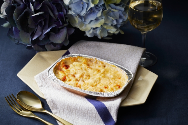 グラタンの味の決め手になるホワイトソースは、フランス料理の基本ソースを意味する「マザーソース」のひとつ。基本のレシピを忠実に守り、バターと小麦粉を弱火でじっくり炒めることで粉っぽさをなくし、牛乳とチキンブイヨンでクリーミーかつコク深く仕上げています。調理工程を丁寧に行いながら美味しさを追求しました。中には大きなエビがたっぷりと入り、ソースに溶け出したエビの旨みも格別です。オーブントースターでチーズを香ばしく焼き上げ、お召し上がりください。