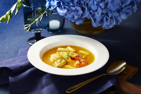 魚介類のエキスを存分に引き出した濃厚なスープをベースに、丁寧に炒めたポロ葱とトマトを加え、サフランで仕上げました。具材には金目鯛、ホタテ貝柱、エビ、いか、ムール貝を使用しており、スープとしてだけでなく、本格的な魚料理としても満足感のある一品です。凍ったまま袋ごと湯煎してお召し上がりください。