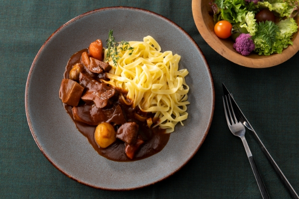 牛タンを丸ごと香味野菜と赤ワインでマリネし、表面を香ばしく焼き上げた後にフォンドヴォーとデミグラスソースでじっくりと時間をかけて煮込みました。スプーンで切れるほど柔らかく仕上げた牛タンは、メインディッシュにふさわしい贅沢な一品です。素材の旨みが溶け込んだ味わい深いソースは、パスタなどのヌードルとも相性抜群で、最後まで余すことなくお楽しみいただけます。