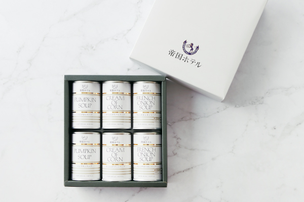 帝国ホテルのロゴ入りギフト箱に、帝国ホテル独自の伝統製法で仕上げたコーンのクリームスープ、あめ色玉ねぎの甘みが広がるフレンチオニオンスープ、そしてクリーミーで優しい甘さのパンプキンスープの3種を詰め合わせました賞味期限も長く、ご家庭の常備品としてもおすすめしたい、手軽ながらも気品あるスープギフトです。