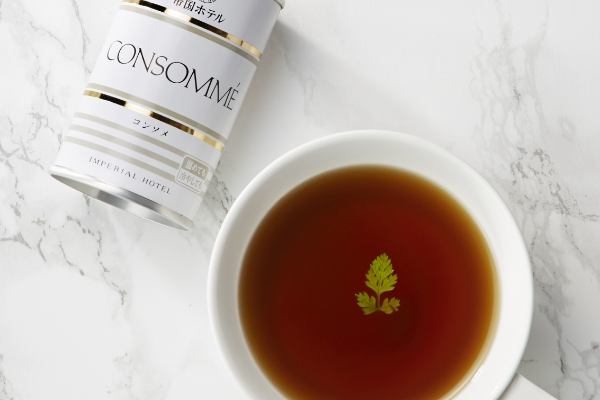 牛肉と香味野菜をじっくり煮込んで旨味を引き出した、琥珀色に澄んだ色合いのコンソメスープです。温めて贅沢な一杯を楽しむのはもちろん、冷やすと自然なジュレ状に固まるため、前菜のアクセントとしてアレンジするのもおすすめです。シンプルだからこそプロの技が光る、素材の旨味と香りがぎゅっと凝縮された帝国ホテル伝統の味わいをお楽しみください。