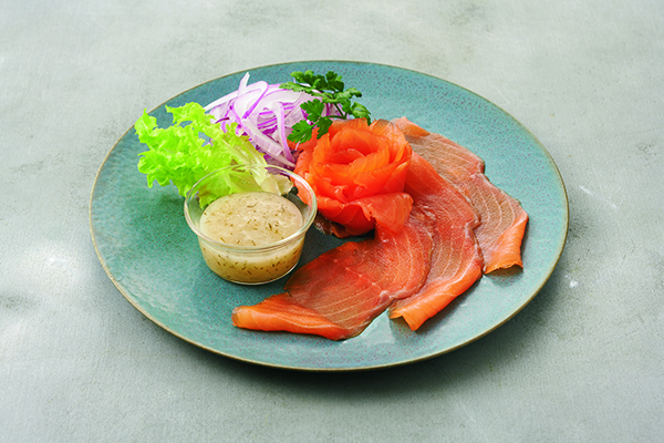 脂ののりが良く、やわらかな身質が特徴のノルウェー産サーモンを、20℃以下の低温で時間をかけてじっくりと燻製しました。余分な水分を飛ばし、旨味をぎゅっと凝縮させ、艶やかな飴色に仕上げています。セットのオニオンマリネと和えてカルパッチョや、ベーグルに挟んだりパスタの具材にしたりと、幅広いアレンジができます。