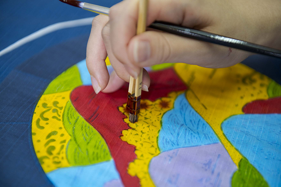 まずは色差し。筆を優しく扱いながら、それぞれの模様に顔料を塗り、乾かし、違う色を塗り、という手順を重ねます。薄い色から順に入れていくのがポイント。模様に色を差し終わったら、次は隈取りに。これは色を差した模様に濃い顔料でアクセントをつけ、全体に立体感を出す作業。びんがたの大きな特徴のひとつです。隈取りをしたら、顔料を完全に乾かしてからアイロンをかけ、水につけ、糊を落とし干して完成。色を差すのにかかる時間は半日ほどですが、焦らずゆっくりと、1週間くらいかけて作業を楽しむのもおすすめです。