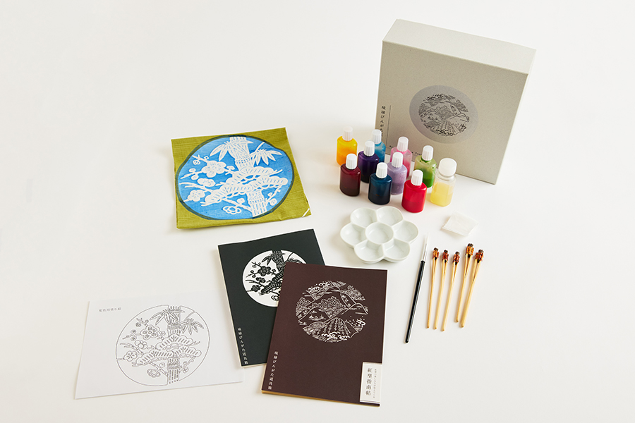 道具箱に入っているのは、型置きされた小風呂敷、配色用の顔料5色または6色(図柄によって異なります)、隈取り用の顔料3色、にじみ防止のレべリン、隈取り用絵筆1本、刷り込み刷毛(太・細)計5本、梅皿と「染め方指南帖」。あとはご自身でエプロンや新聞紙、ドライヤーなどを準備するだけ。 ※柄によって、道具箱に入っている配色用顔料は異なります。写真は松竹梅模様バージョン。