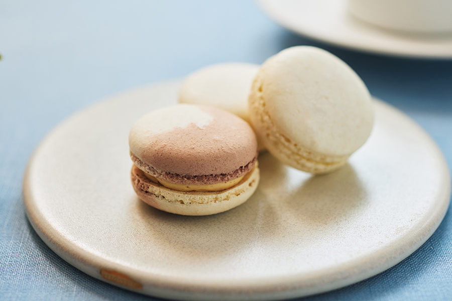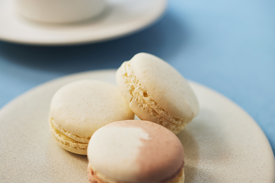 ココナッツのマカロンは、ノーブルな白さも印象的。甘酸っぱい苺のコンポートと、バニラが豊かに香るガナッシュが、ココナッツを焼き込んださくさくの生地を引き立てます。「ココナッツのやわらかい甘味に苺の酸味で軽さを出し、バニラで全体をまとめました」(岩柳さん)。