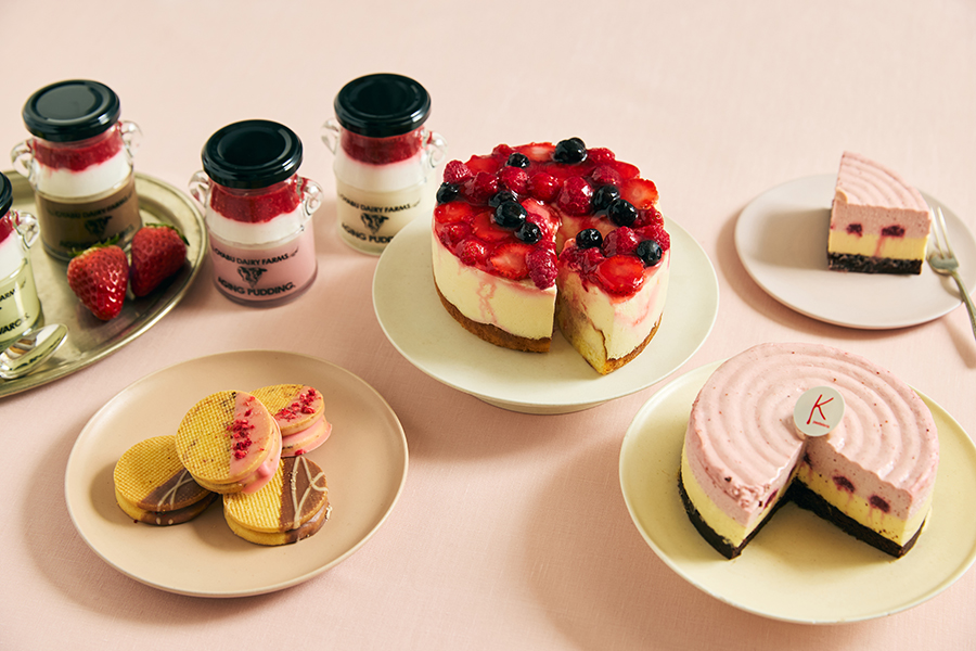 北海道産の食材を中心に、美味しさと親しみやすさを追求し、丁寧な手作りにこだわるパティスリーが贈る、心意気あふれるホールケーキ。下段のベイクドチーズケーキは、北海道産のいちごを加えて焼き上げ、軽やかな印象に。上段のレアチーズケーキはこだわりの卵を使い、口当たりの良いムースに仕立てています。