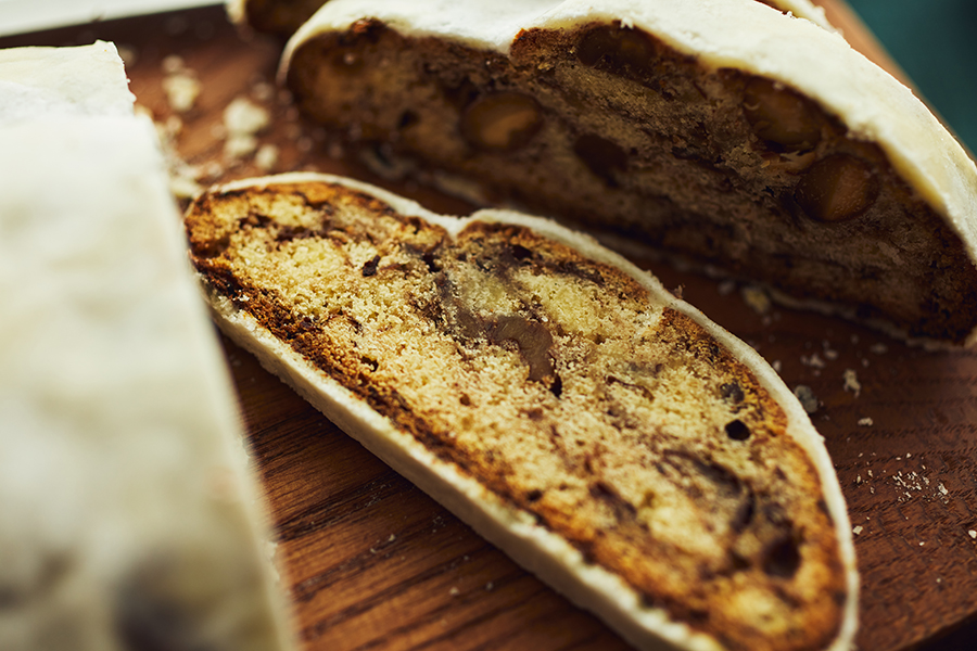 古くは14世紀のドイツでクリスマスの贈り物として用いられたともいわれる「シュトーレン」。クリスマスへのカウントダウンでもある「アドベント」の期間中、薄切りにしたシュトーレンを毎日少しずつ味わうという習わしもあります。「朝、薄くスライスして一枚、夜にゆっくりと一枚。ドライフルーツやバター、生地の醸すシュトーレン自体の熟成香が日に日に変化していく様子も、ぜひお楽しみください」(延命寺さん)。