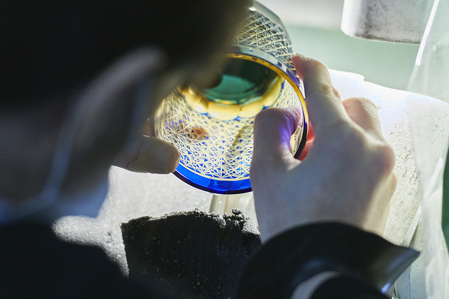 1906年に東京・深川でガラス瓶の製造会社としてスタート。関東大震災で会社が焼失し、都内で事業を続けるも工場の老朽化もあり、縁あって小樽に移転することに。これを機に、長年受け継がれてきた吹きガラスの技術を生かした生地作りだけでなく、目で見て、使って楽しめるようなものをと考え、職人を修業に出して技を磨かせました。クリアなガラスに色ガラスを被せた江戸切子や薩摩切子と区別して、深川硝子工芸が色ガラスに色ガラスを被せ、文様を彫ったものを小樽切子と称するようになりました。