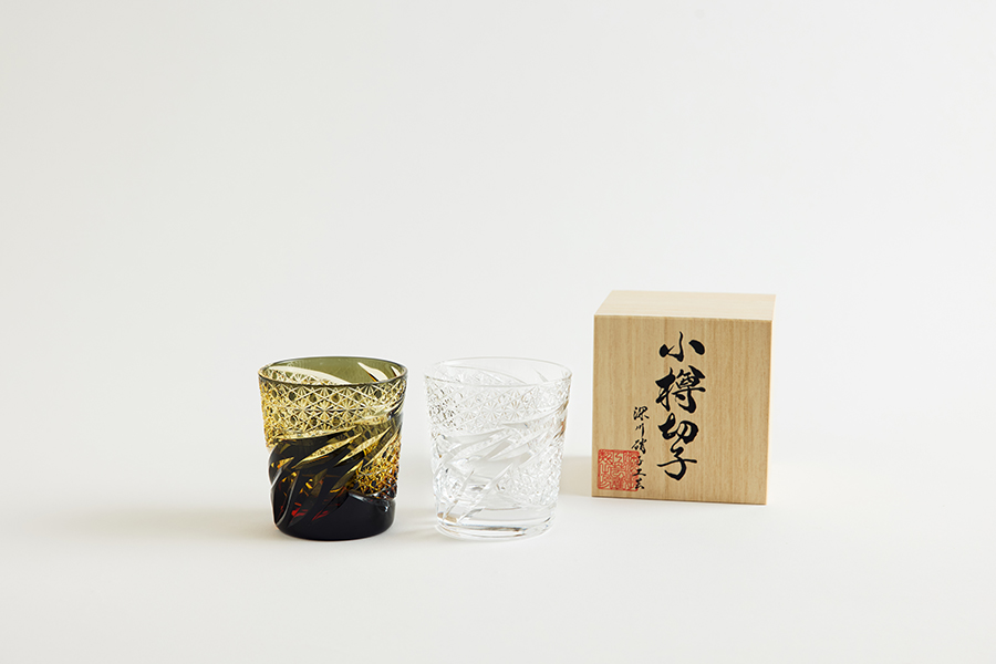 「雅(みやび)」シリーズは小樽切子の看板商品となるものを作りたいと、代表の出口健太さんと職人の沼田たまえさんが考案し、試作を繰り返して完成したもの。左はオリジナルカラーの「黒琥珀」。モダンな色柄でありながら、温かみが感じられます。右の「透き」はクリスタルの美しさが際立ち、切子のカットを通してあらゆる飲み物を美しく魅せる珍しい一品。どちらもずっしりとした重厚感がありますが、手作業ならではの繊細で柔らかなフォルムと深いカットで、手にしっくりなじみ、使うほどに愛おしさが増します。1個ずつ桐箱入りでお届けします。