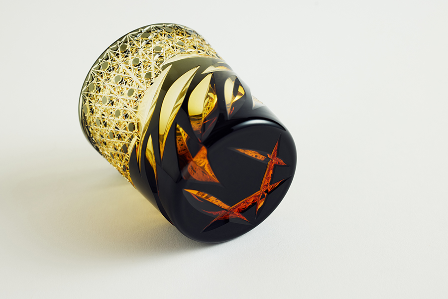 通常、切子グラスの底と側面は別のデザインが施されますが、雅は底から側面へ流れるようにつながる模様が特徴です。この躍動感のあるモチーフは、底から右上に飛躍するさまを表現。非対称のデザインなので、お好きな飲み物を注いでさまざまな面を眺めていただくと、異なる表情をお楽しみいただけます。上部の繊細な文様は菊籠目という大変技術を要するカット。新旧の技が美しく調和するだけでなく、菊には高尚や高貴、籠目は魔除けの意味があり、飛躍を表すカットとともに縁起を担ぐ贈り物としても喜ばれます。