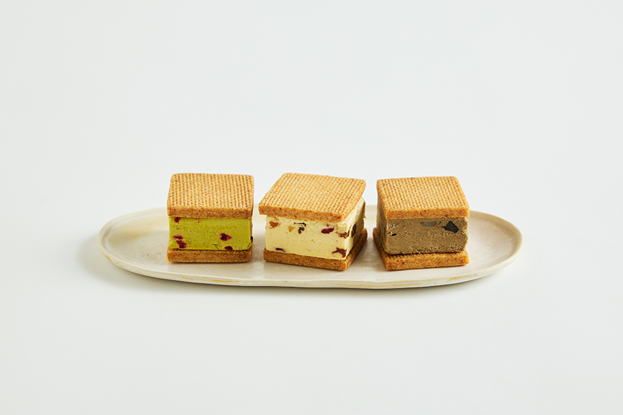 バターサンドは、左から「ピスタチオ&フランボワーズ」、「ラム&フルーツ」、そして和テイストの「ほうじ茶&甘納豆」の3種。あっさり食べられるようにと、バタークリームには空気をたくさん含ませ、軽やかな仕上がりに。「食べた後に、もう1個食べたいと思ってもらえるくらいの味わいを目指しました」(パティシエ若山さん)。クッキー生地はさっくりと軽い口当たりで、蒜山ジャージー生乳100%のバタークリームを引き立てます。