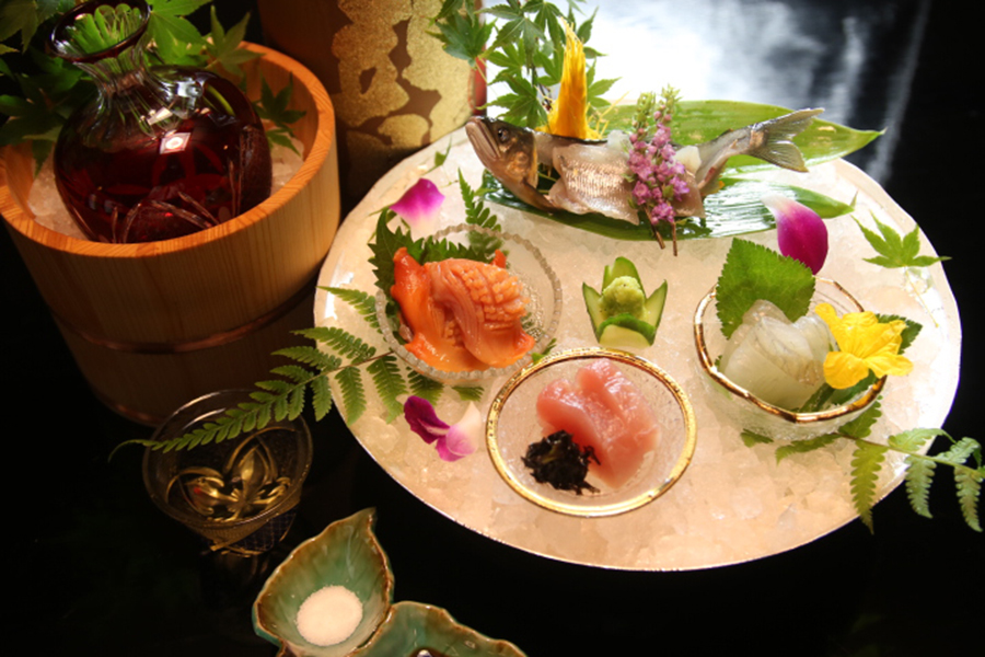 お茶席の後は、その余韻に浸りながら夕餉のひとときへ。用意されるのは、嵯峨野の自然の恵みを取り入れた、鮎料理を中心とした季節の献立です。保津川の水を引いた生け簀で泳がせた活鮎のお造りや炭火の塩焼き、鮎ご飯など、解禁間もない季節の味覚が並びます。15代目店主の井上易洋さんいわく「その時季にいちばん美味しいものをお出しするのが、うちの信条です」。
