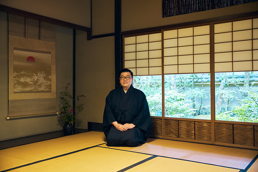 現在、この宿を守るのは、15代目店主の井上易洋さんと女将の京佳さん。「料理を楽しみに来てくださるお客様がほとんどですが、そこに茶の湯や蛍という情趣あふれる楽しみが加わるのは嬉しいことです」と井上さん。本プランの開催時は、庭園の青紅葉が美しい頃。日々濃さを増す緑の中に桔梗の花が彩りを添え、みずみずしい生命力が感じられます。季節が夏へと向かう端境(はざかい)の時季、静寂と風情に満ちた嵯峨野での時間を、心ゆくまでご堪能ください。