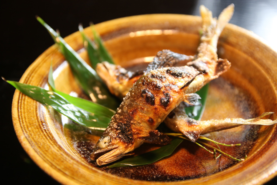 食材の魅力を最大限に引き出すため、「鮎の宿 つたや」が徹底しているのが、近火焼き。炭火を鮎のすぐ近くに据え、短時間で一気に焼き上げることで、身の内側から脂が巡り、驚くほどふっくらとした仕上がりになります。「よい鮎は内臓(わた)に良質な脂をたっぷり蓄えています。そこに炭火の熱が加わると、その脂が溶け出し、内側から自らを蒸し焼きにするように香り高く焼き上がります」(井上さん)。塩焼きの香ばしさ、炊き立ての鮎ご飯のおいしさ。清流に育まれた鮎の旨味を、料理人の技とともに味わう至福のひとときです。