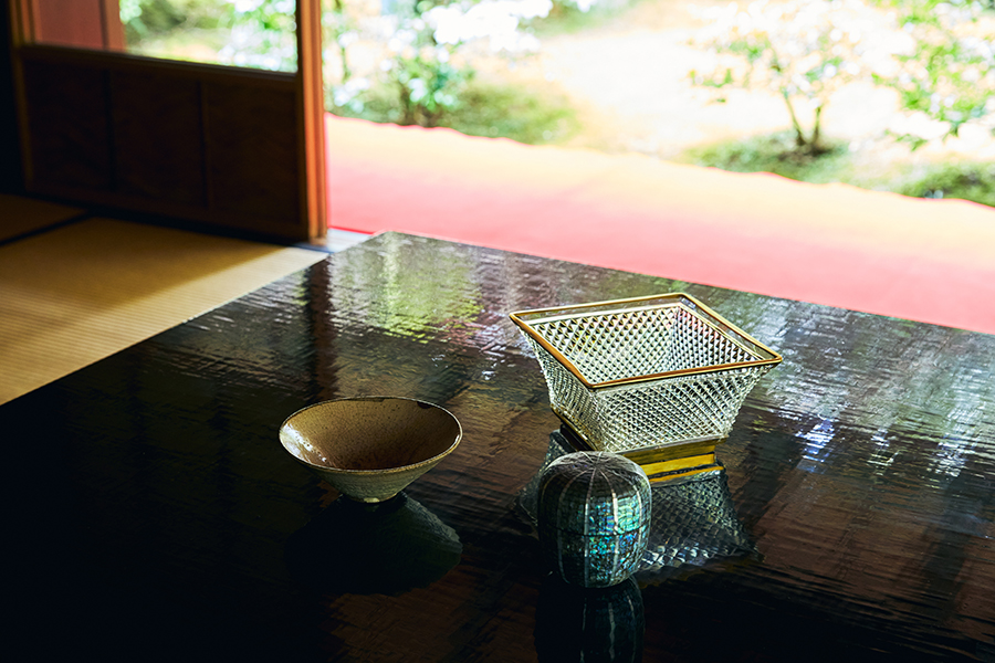この日の茶席では、初夏の趣向に合わせた茶道具が用意されます。例えば、日本を代表する木漆工芸家である黒田辰秋氏が手がけた螺鈿の棗(らでんのなつめ)や、桃山期の風格を感じさせる「皮鯨(かわくじら)」の茶碗、そして明治期の美術商・春海商店がフランスのバカラ社に注文した枡鉢等々。「茶の湯では、器や菓子、しつらえの細部にまで季節の意匠を込めます。今回の席でも、蛍を思わせる趣向や初夏の風情を宿した道具がお目見えするかもしれません。どうぞ楽しみになさってください」(木村先生)。時季の情趣を映す道具を手に取り、その重みや表情を愛でることで、茶の湯の醍醐味がより深く感じられることでしょう。