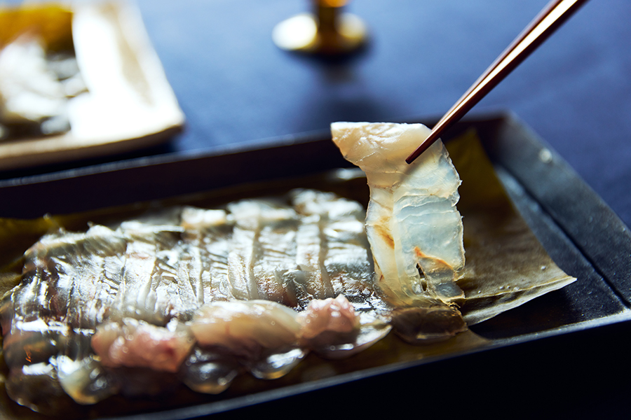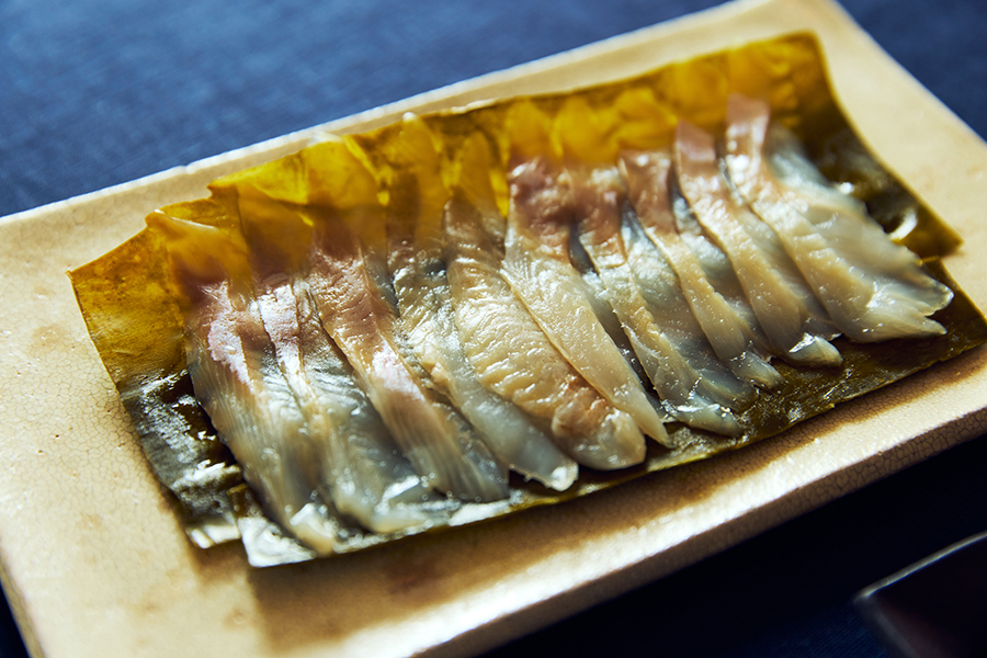 根ホッケとは、ホッケの一種。通常のホッケとは違い、回遊せずに岩礁など一定の場所に根付いて過ごすホッケです。回遊をしないため脂ののりもよく、函館では人気を集める魚介の一つ。その根ホッケを真昆布で締め、双方の旨味を凝縮させました。根ホッケ独特の風味に昆布の柔らかな旨味が重なり、まるで海の風景が見えるかのような味わいです。