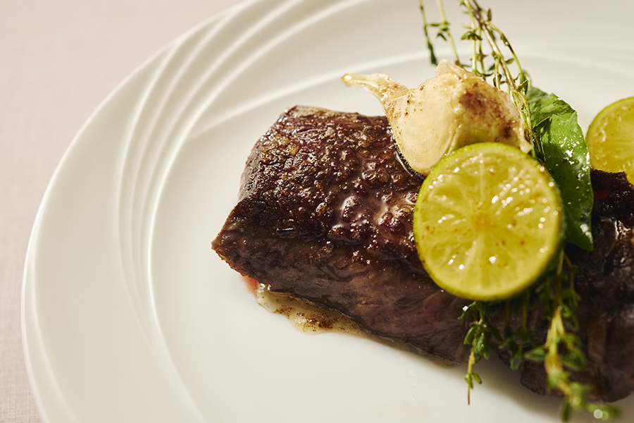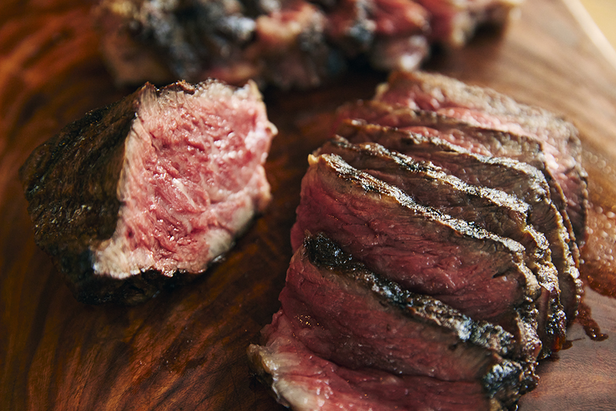 このレシピは、霧島和牛の塊肉を薪焼きレストランThe TERRACE同様、薪焼きを感じる薫香を纏わせ、ご家庭でも一段上の味わいになるよう仕立てました。出産を経験した経産牛を、時間をかけて再肥育しているため、脂身が少なくさっぱりとした旨味が特徴。お好みの厚さにカットし、両面を焼き上げてステーキでどうぞ。