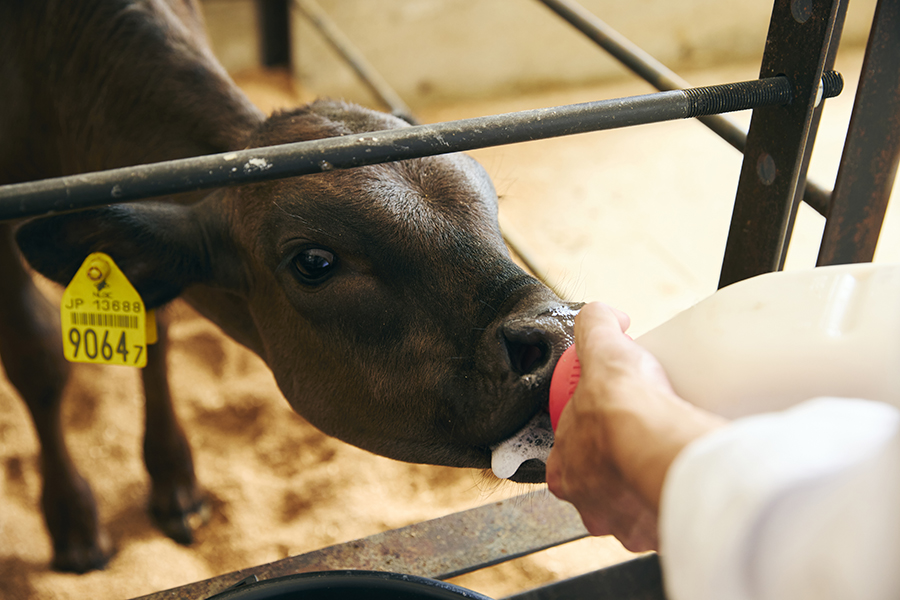 霧島和牛の特徴は、オメガ3脂肪酸※を含んだアマニ油を混ぜた自社開発の飼料を与えること。安心安全を第一に牛の餌にはホルモン剤や抗生物質などは使用しません。また仔牛には手やりで授乳をし、成長や体調に合わせて餌の配合を調整するなど、愛情と時間をたっぷり掛けて育てています。結果、上質な脂、きめ細かな美しいサシの入った霧島和牛になるのです。