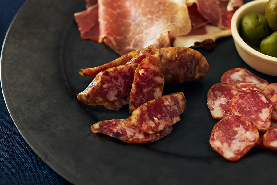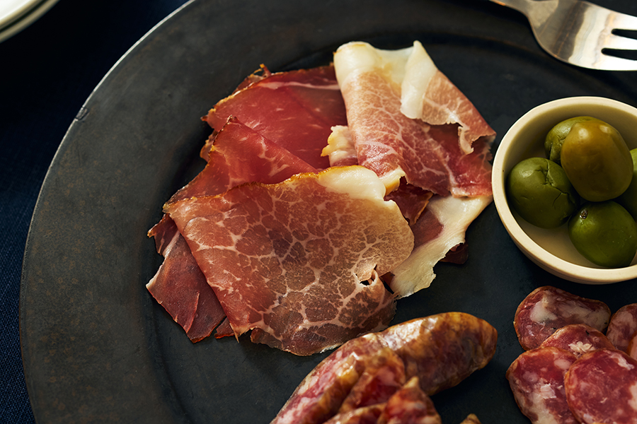 「ラックスシンケン」は、もも肉の芯を使い、適度に脂を残して5か月熟成させた生ハムです。やわらかな歯ざわりに程よい塩気と脂のやさしい甘味が重なります。薄くスライスしてそのまま前菜に。レモンとオリーブオイル、バターを塗ったパンとも好相性です。