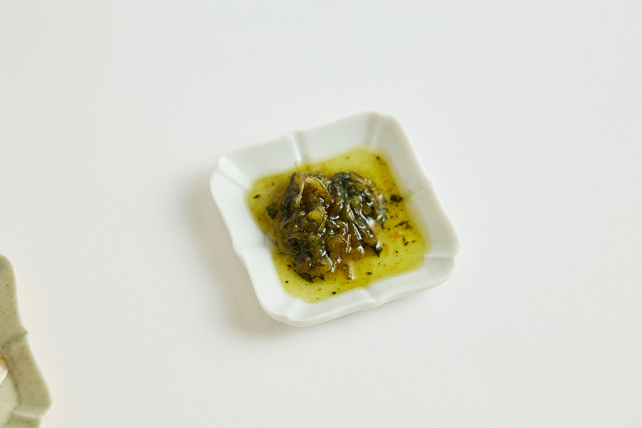 えびジェノベーゼは、大葉やくるみ、パルメザンチーズなどをきかせた洋風仕立て。大葉の爽やかな香りが特徴です。パスタソースやピザソースに使うのはもちろん、マヨネーズと合わせて焼き立てのトーストにたっぷり塗るのもおすすめ。チーズやクラッカーにのせれば、おしゃれなアペリティフにもなりそうです。