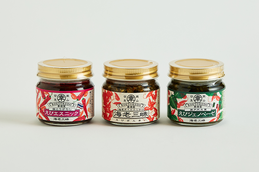 瀬戸内海に面した岡山・備前の日生町(ひなせちょう)は、古くから漁業で知られる小さな港町。牡蠣の養殖などでも有名ですが、地元の人々にずっと親しまれているのが、しゃこや小魚、そして小ぶりな“ガラえび”です。風味豊かなこの小さなえびたちを主役にした、瀬戸内らしい万能調味料が登場しました。ベースとなっているのは、素材の色や香りを損なわないひまわり油に漬けた、たっぷりの「干しえび」。えびの旨味が凝縮されたオイルに各種香辛料などを加え、3種の味に仕立てました。