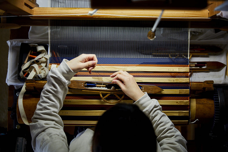 伝統的な着物地「丹後ちりめん」を手がけてきたクスカファブリックが、機械に頼らず、昔ながらの手織り織機で生産。職人が五感を駆使して最適な糸のテンションを見極め、気候や気温に合わせて織り方も微調整しながら、ひと越し、ひと越し、手作業で織り上げます。糸と糸の間に程よく空気を含んだ優しい風合いと凹凸が生まれ、見る角度や光の当たり方で表情が変化。奥行きのある陰影が生地に宿ります。