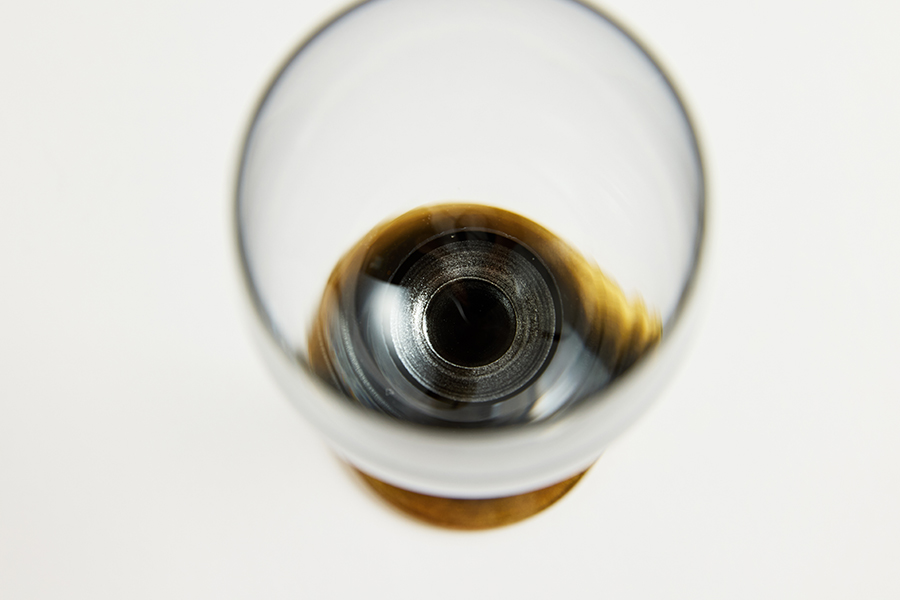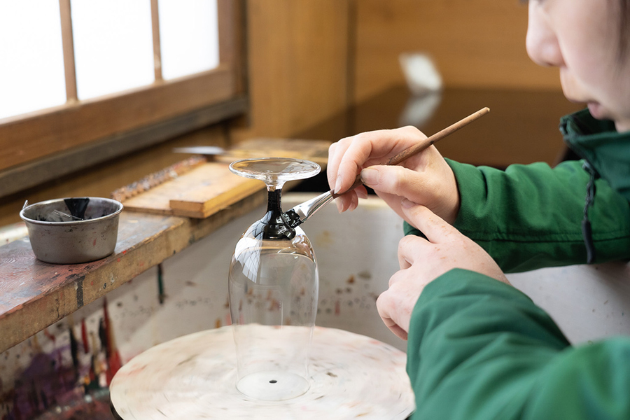「通常、漆は木地に塗るもの。木は表面にたくさんの細かい穴が開いているので、漆をしっかりと吸い込んでくれるんです。けれどガラスは本当に“面”で無機質だから、同じように仕上げるわけにはいきません。漆とガラスを美しく融合させるために、弊社で独自の技術を編み出し、漆職人がひとつずつ、手仕事で仕上げています」(丸嘉小坂漆器店・小坂玲央さん)。