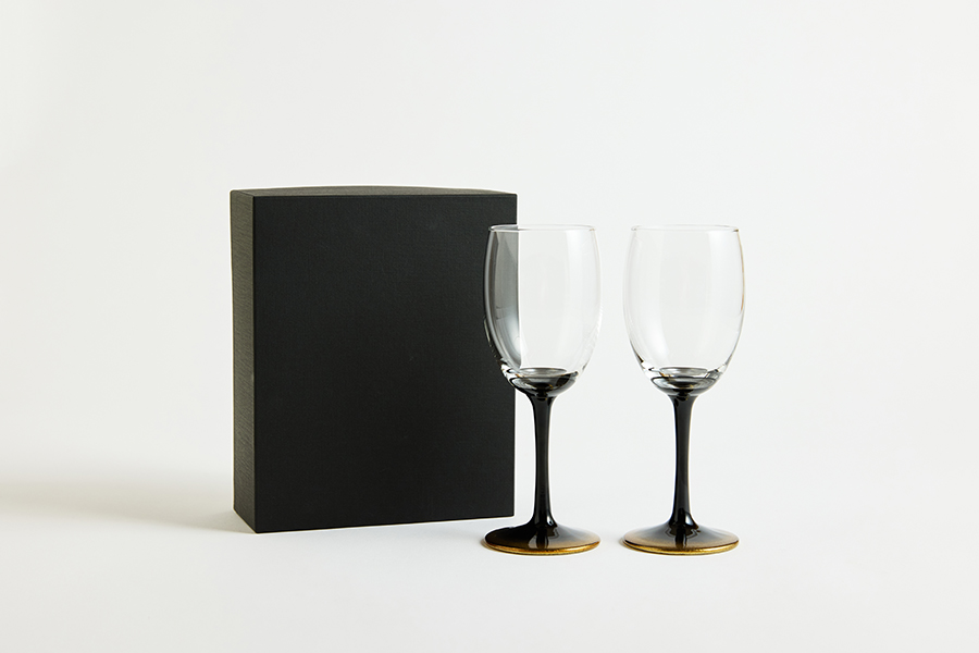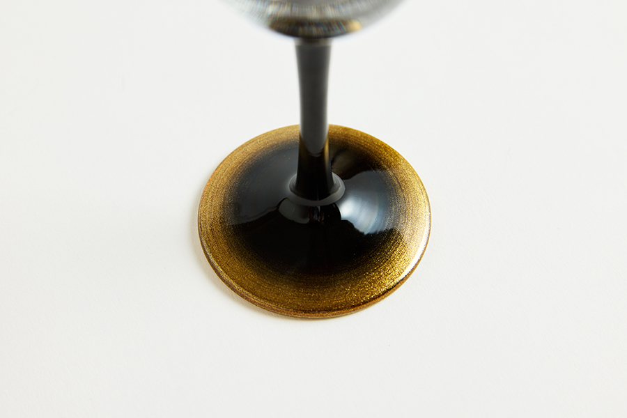 よりシックな佇まいを見せるのは、ゴールドと黒の漆をエレガントにあしらったワイングラス。ステムには黒を配し、ゴールドと黒の組み合わせが華やかなプレートへと続きます。漆とガラスという和と洋の組み合わせは、クリスマスはもちろん、おせち料理のシーンにも合いそう。新年の乾杯はこのグラスにおまかせです。