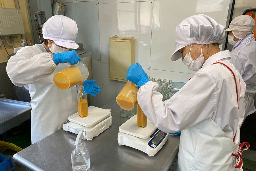 実は、地元・九度山町では小学校の給食に柿カレーが登場することも。隠し味に柿を使ったカレーは、地元ではポピュラーなメニューです。「カレーに加工するのは、工房のある椎出エリアの農家から届いた、完熟の富有柿。皮と種を取って薄切りにしたら、ピュレとチャツネにしてカレーに加えていきます」(横手さん)。カレー1パックに、約40%も柿を使うという贅沢さです。