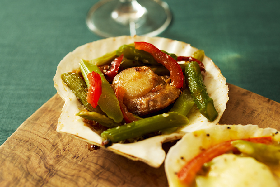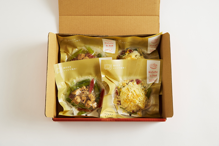 小樽で稚貝から2年間、大切に育てられた帆立貝を柔らかく蒸し、北海道産の野菜や乳製品と合わせて2種のソースで仕上げました。小樽の養殖帆立は日本海の荒波にもまれて育つため、身が締まり濃厚な旨味が魅力。この帆立を新しい味で手軽に食べていただきたいと商品化に挑戦したのが、小樽・祝津で魚卵製品を手掛ける老舗企業「入久三浦水産(いりきゅうみうらすいさん)」です。素材から調味料に至るまで選び抜かれたものを使用し、丁寧にすべて工場内で調理しています。ソースはリゾート地のニセコでレストラン「杏ダイニング」を営む前田伸一シェフが監修。「焦がし醤油&バター」と「ベシャメル&チーズ」の2種セットです。