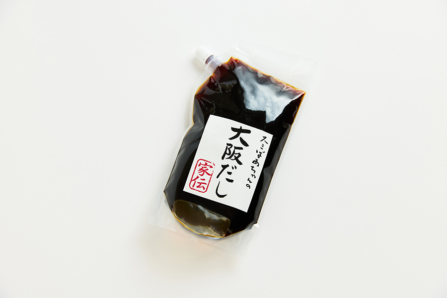 「大阪だし」は、大阪生まれ大阪育ちのスミばあちゃんが手塩にかけて作った万能調味料。旨味の中にまろやかな甘味も感じられる、大阪らしい味わいです。スミばあちゃんが家族のために作っていただしを近所の人に分けたところ、「美味しい!」と評判を呼び、5年前についに商品化。北海道の羅臼昆布と九州産のかつお、さらには醤油、砂糖、節(ぶし)まで、一貫して国産の材料を厳選し、手作りしていることが美味しさの秘密です。添加物や化学調味料は一切不使用。だしはそのままストレートで使ったり、水で割ったり、みりんや酒と合わせたりと、料理用途によって使い方はさまざま。透明な軽量パウチ袋のパッケージも冷蔵庫のポケットにすっと収まり、使い勝手も抜群。キッチンに常備したい優秀調味料です。