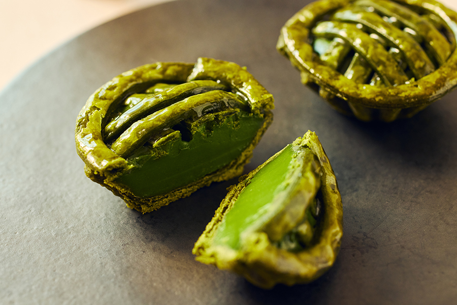 こうして誕生したのが、抹茶を練り込んだパイ生地と、鮮やかな緑色をたたえる香り豊かなテリーヌが見事に一体化した抹茶のパイ。余すところなく抹茶の風味を堪能できるのは、甘さを控え、素材本来の味わいを生かしているから。実は今回、杉本は、帝国ホテル伝統の“ブルーベリーパイ”にオマージュを込め、作り方の手法だけでなく、表面を覆うパイ生地のサクサク感や編み込みのスタイルまでレジェンドスイーツに倣っています。