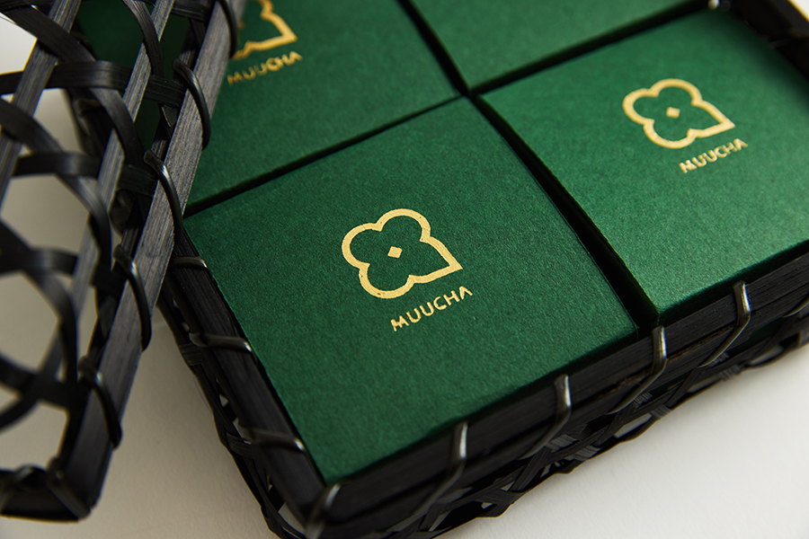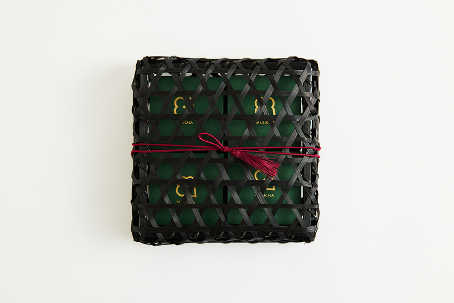 遂に完成したのが、こちらのパッケージ。個包装用の箱は宇治抹茶を連想させる美しく上品な深緑色。外箱は黒色の竹籠で仕立てました。竹籠の編み目はあえて粗くしてあり、パイの編み込みをほうふつとさせ、中の箱が透けて見えるところがまた素敵。和を感じさせつつ落ち着きすぎないスタイリッシュさがあり、抹茶のパイの魅力を一段と格上げしてくれます。作り手両者の丁寧な仕事と豊かな感性が見事に表現されていて、贈り物にしても喜ばれそうです。