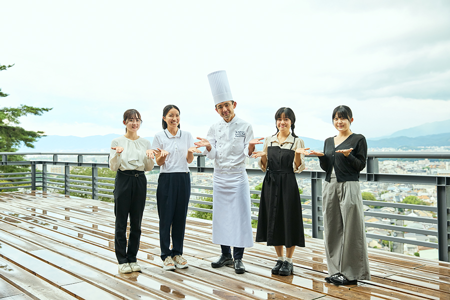 京都の町を一望できる、京都芸術大学瓜生山キャンパスの屋上テラスにて。杉本とMUUCHAのチームの皆さんの笑顔から、このプロジェクトの充実ぶりが伺えます。