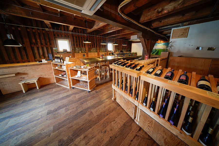 ワインをつくるにあたってまずお二人が決めたのは、「幸せのワイン」というテーマ。「ワインは人生を豊かにしてくれるもの。飲む人、手に取る人が幸せな気持ちになるワインを目指しています。五感でダイレクトに幸せを感じていただければ」(長さん)。週に一日、醸造所内のショップとバーもオープンしています。