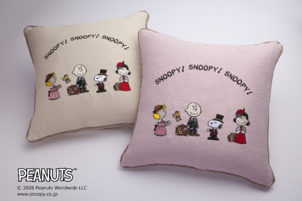 帝国ホテル 大阪のシンボルとして愛されている「ドアマン・スヌーピー」とその仲間たちの刺繍を大きくあしらったクッションです。ピンクとベージュ2色のカラーでご用意しております。