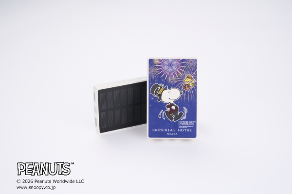 帝国ホテル 大阪オリジナル「ドアマン・スヌーピー」と、夏の夜空を彩る色鮮やかな打ち上げ花火を描いたモバイルバッテリー。小ぶりながらソーラーパネル搭載で2台同時に充電も可能。ご旅行や非常時にも活躍します。