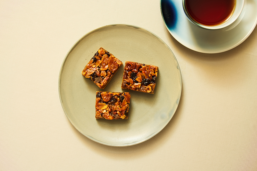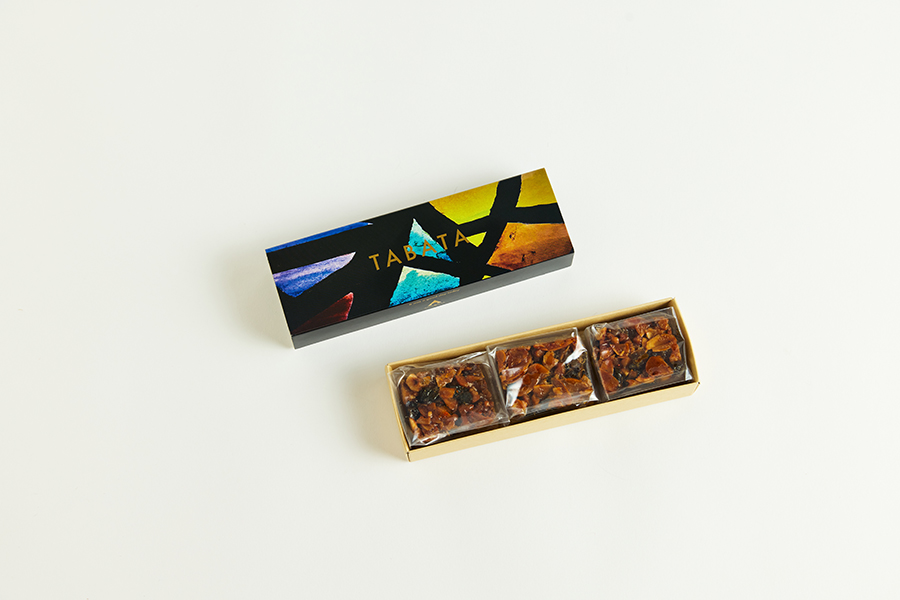 北海道産の新鮮な素材を使い、レストランのデセールと同じクォリティのスイーツを作り続けるパティスリー メゾンフジヤ ハコダテ。オリジナルなおいしさを持ち、記憶に残る焼き菓子を生み出すべく、料理的な視点からも試作を重ねた末に完成したのが、この「TABATA」です。数週間漬け込んだ生姜や実山椒、唐辛子などが素敵なアクセントを加えます。手作業で仕上げているため、生地上のナッツやスパイスの混ざり方はランダム。カットされた箇所によって、微妙に異なる食感や香ばしさを楽しめるのも、嬉しいポイントです。