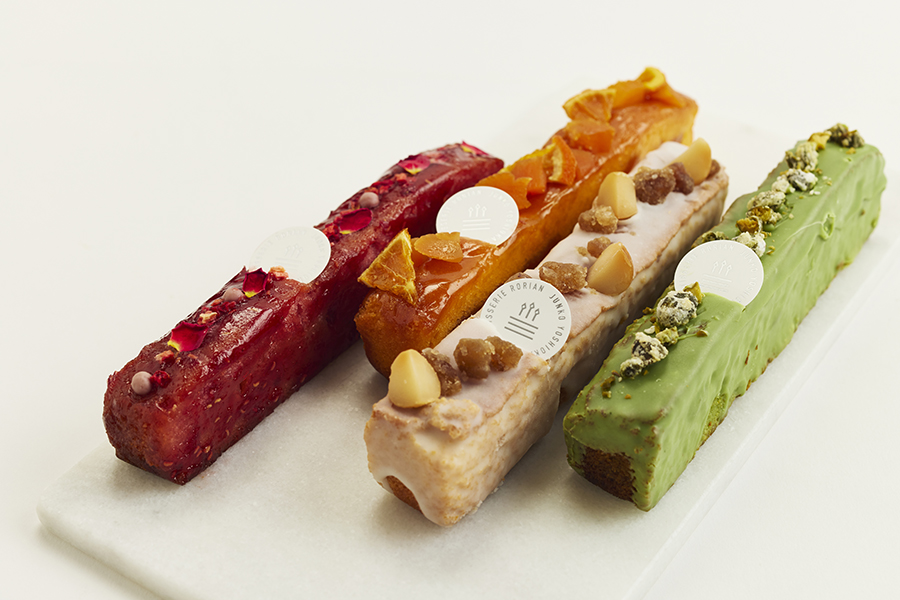 (右から)ピスタチオとキルシュに漬けたクランベリーの食感が大人っぽい「ピスタチオ」、フランス産マロンペーストと栗の渋皮煮がまるごと入ったリッチな「マロン」、完熟のアプリコットをなめらかな生地に合わせたジューシーでみずみずしい「アプリコット」、「フレーズローズ」は甘酸っぱいいちごとバラを組み合わせた華やかなテイストです。