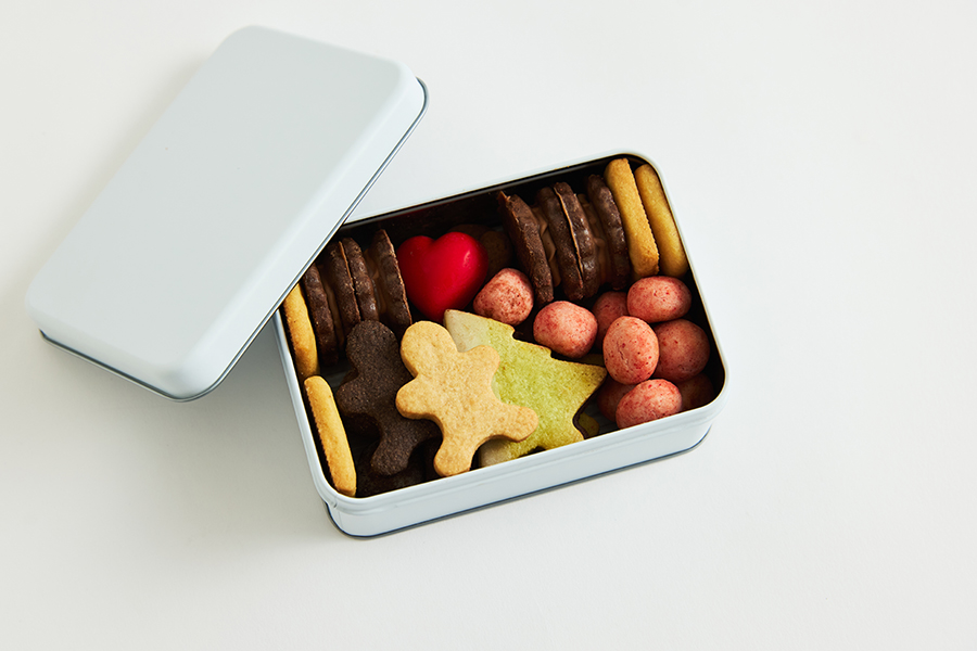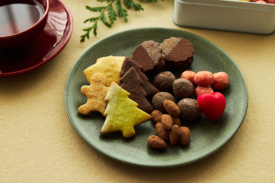 パッションルージュトリュフ、アマンドショコラ、ショコラサブレサンド、ホロホロショコラ、黒糖サブレ、ツリーサブレ、ジンジャーマンクッキー、フレーズボウル。ほろり、さっくりなど食感の違いもじっくり楽しんで。チョコレート系のサブレには生地に焼き塩を隠し味としてプラスすることで、チョコレートの風味がいっそう引き立ちます。紅茶やコーヒーはもちろん、日本茶とも相性よし。ティータイムや食後のひとときに、クリスマスシーズンの集いにぴったりなクッキー缶です。