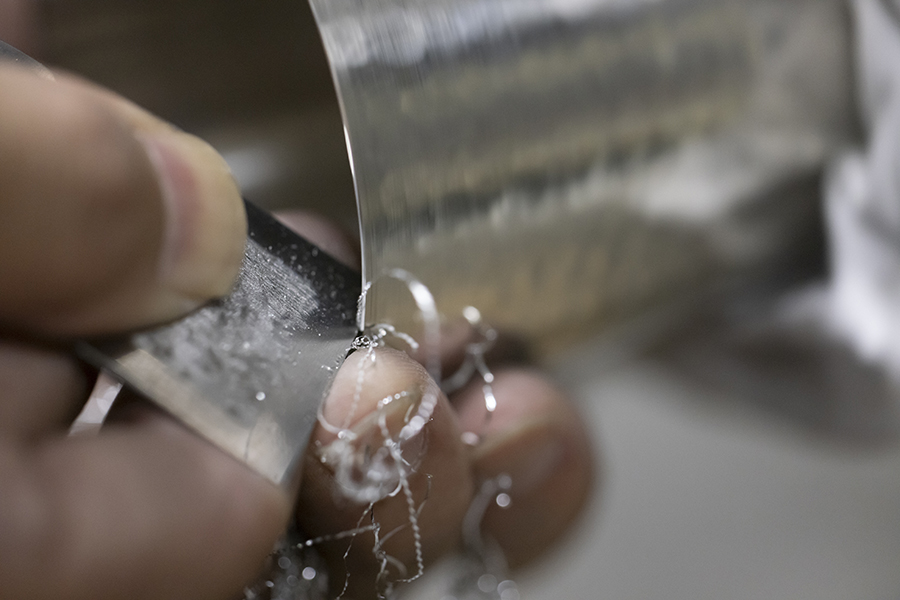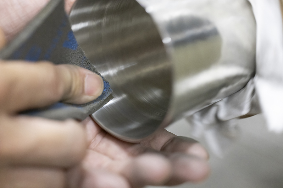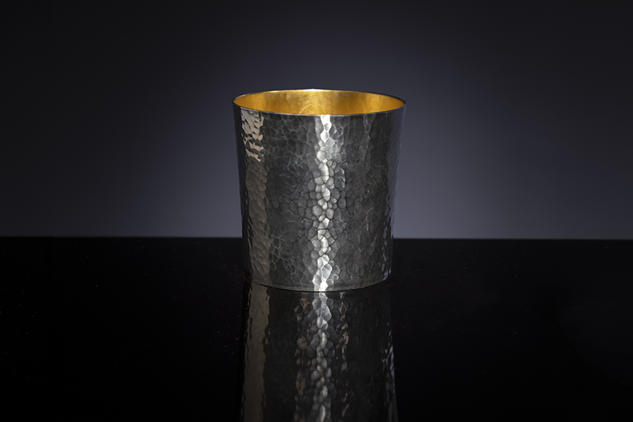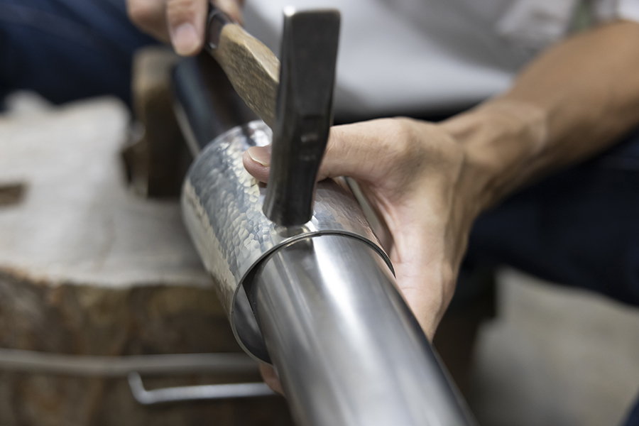 金鎚で打ち付け、「鎚目」の肌あいを入れていきます。丸いタンブラーの形はそのままに美しい鎚目を入れていくのは、ことさらに気を遣う作業。金鎚の金属部分の素材や硬さ、柄の塩梅など、使用する道具もひとつひとつの細部まで厳選しています。この後、底部分を溶接。