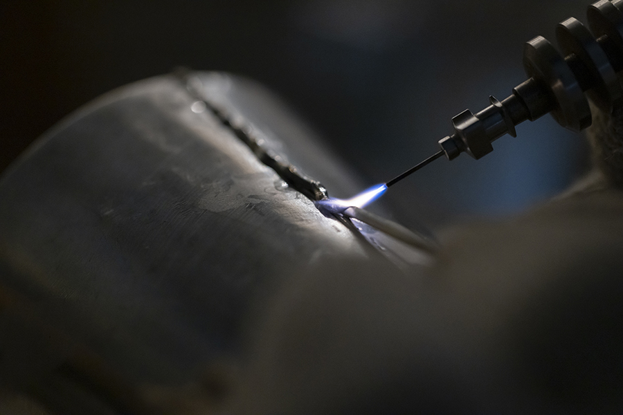 錫製品はすべて一枚の錫板から作られます。錫にわずかな銀を配合した清課堂オリジナルの錫板をそれぞれの大きさに切り、丸めて、バーナーで溶接。タンブラーのベースの形が出来上がります。