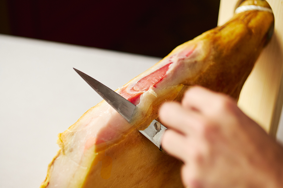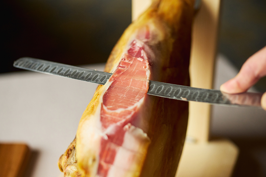 赤身が見えてきたら、刃の薄いナイフに変えて、削るように切り取っていきます。骨にぶつかったらひっくり返して、同じように脂をそぎ落してから赤身を切り取ってください。失敗しても大丈夫。みんなでにぎやかに切り分けていくのも、楽しいもの。好きな厚さや大きさで食べられるのも原木生ハムの魅力です。
