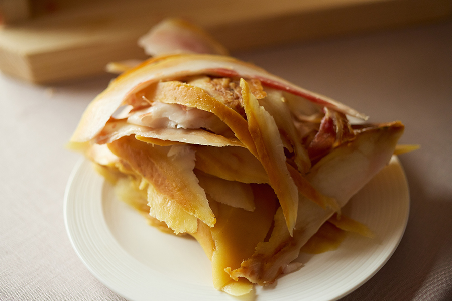 原木からスライスしたばかりの生ハムは、真空スライスパックでは味わうことのできない、みずみずしい風味と食感にあふれています。切り取る部位によって、異なる味わいに出合えるのも“1本”の原木生ハムだからこそ。スライスしてそのままはもちろん、ポテトサラダのトッピングや、いちじくや干し柿といったフルーツと合わせても素敵な一皿に。