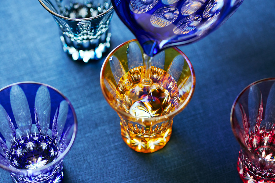 天満切子で人気の天開型(上に向かってゆるやかに広がる形状)で柔和な印象のぐい呑み。上から覗いたときに文様が最も美しく映り込むよう、細やかな計算のもとにフォルムを追求しました。大きさや手に取った時の重量感も程よく、専用の桐箱入り2個セットなので贈り物にもおすすめ。色は「金赤」「青」「正倉院ブルー」「琥珀」の4色の中からお好きな2種をお選びいただけます。